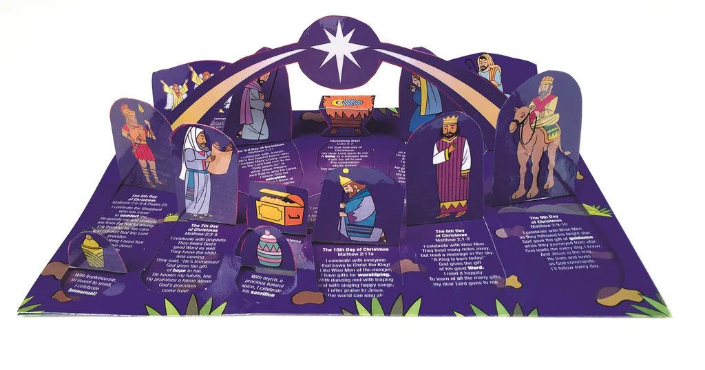 When Advent begins, lay this unique calendar on a table of mantelpiece. Each day of December, lift up a numbered window. What will pop up? A shepherd or sheep? And angel or Wise Man? Perhaps a sky filled with angels! When Christmas arrives, an entire nativity scene will appear where there was once a scene of empty Bethlehem hills.